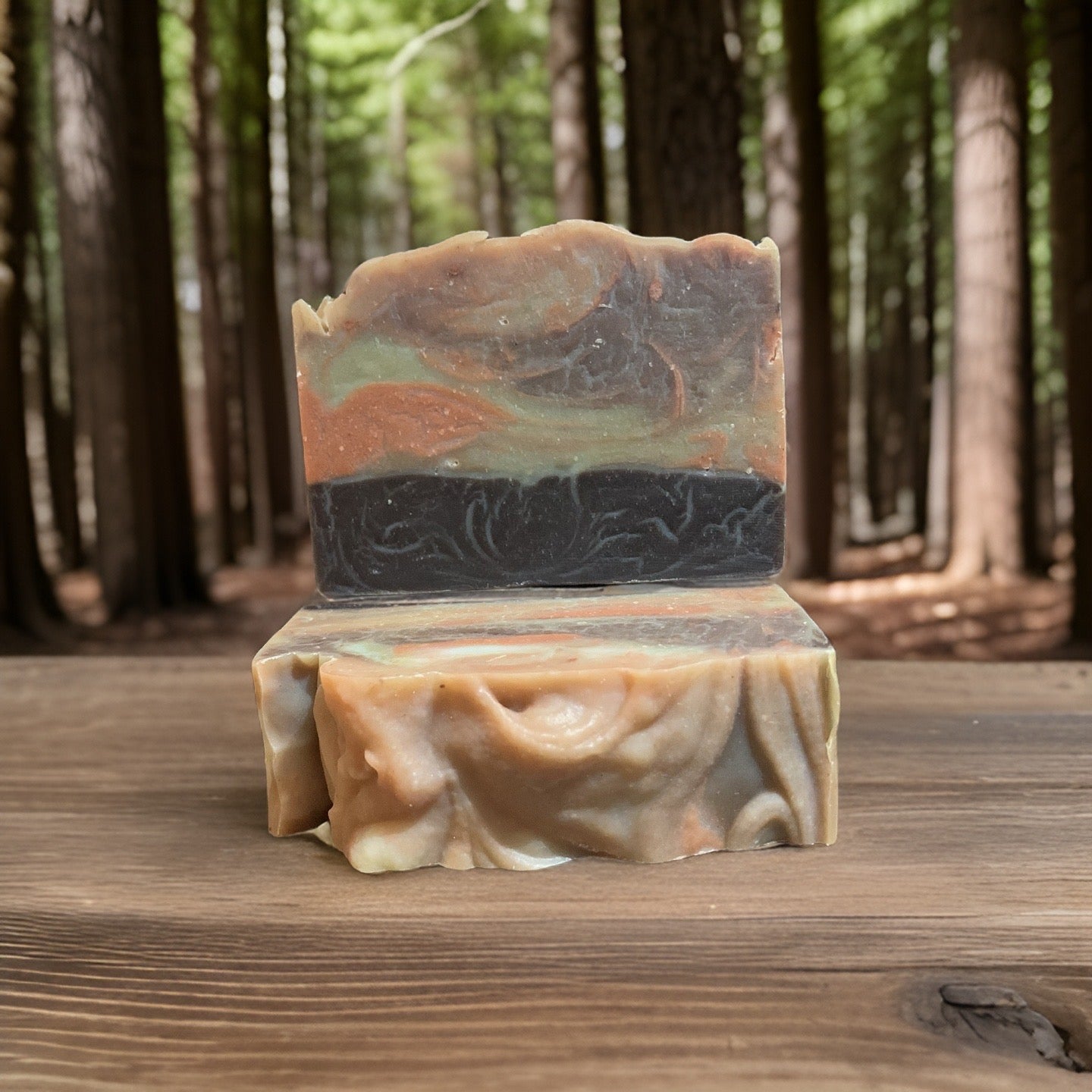 Saponified 100% oils of Olive Oil, Coconut Oil, Shea Butter,Cocoa Butter, Avocado Oil, Castor Oil, White Kaolin clay, Orange Moroccan clay, French green clay,Chlorella, Cocoa Powder, essential oil blend of Fir Needle, Cedarwood, Frankincense, Cinnamon Leaf, Sandalwood, Sweet Orange